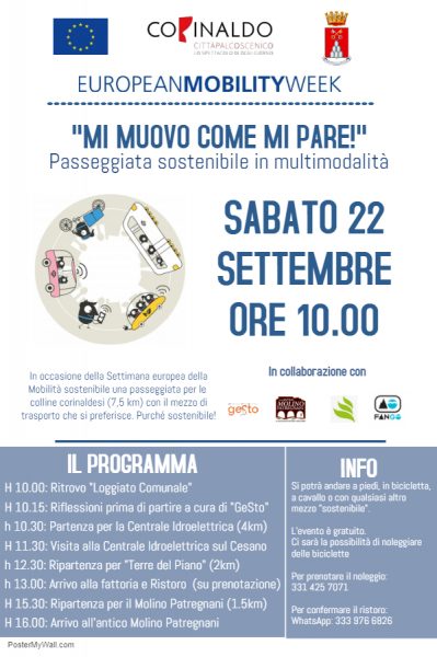 22 settembre ,alle ore 10.00, in occasione della Settimana europea della Mobilità sostenibile, il Comune di Corinaldo, in collaborazione con “Ge.Sto.”, “Molino Patregnani”, la fattoria “Terre del Piano” e “Fango Escursioni”, organizza la passeggiata sostenibile in multimodalità “Mi muovo come mi pare”, un percorso di 7.5 chilometri per le colline corinaldesi con il mezzo di trasporto che si preferisce: a piedi, in bicicletta, a cavallo o qualsiasi altro mezzo purché sostenibile.