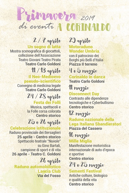 Il 25 e 26 aprile il Comune di Corinaldo ospiterà il raduno provinciale dei Bersaglieri; giovedì 25 aprile nel Centro storio andrà in scena lo spettacolo teatrale “Nuvole” su Gino Bartali, campione di sport e di vita, esibizione che verrà replicata venerdì 26 aprile al Teatro Goldoni di Corinaldo. Sempre venerdì 26 aprile, appuntamento con il raduno automobilistico Lancia Club in via del Fosso. Lunedì 29 aprile la Piazza Il Terreno ospiterà l’itinerante “Motoraduno Wonder Umbria” con il patrocinio dei Borghi più belli d’Italia. Sabato 4 e domenica 5 maggio “Corinaldo in danza” al Teatro Carlo Goldoni.