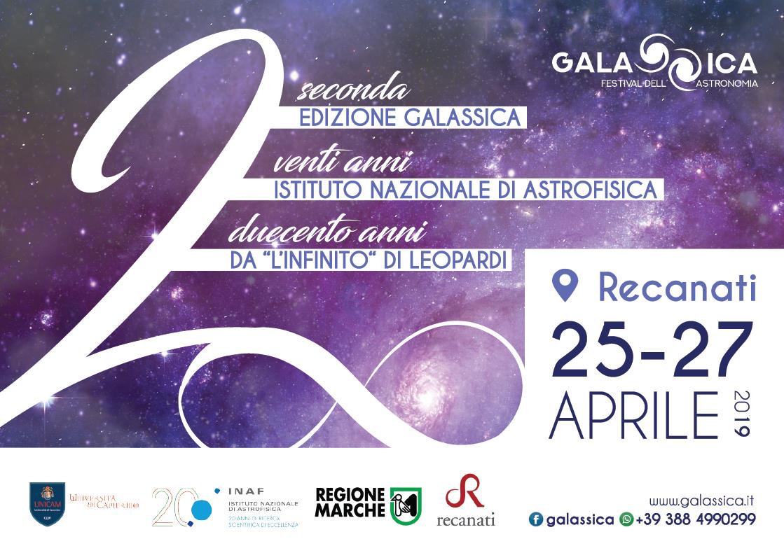 L’evento ha il patrocinio di: Università di Camerino, INAF, Regione Marche e del Comune di Recanati. Galassica è un progetto di festival itinerante che nella sua prima edizione, targata 2018, ha avuto luogo a Macerata.