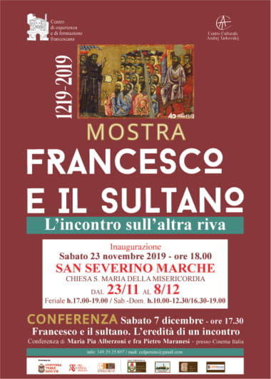 SAN SEVERINO MARCHE – Il Centro di esperienza e di formazione francescana, che ha sede presso il convento dei frati minori cappuccini di San Salvatore in Colpersito, in collaborazione con le Sorelle povere di Santa Chiara, con l’Ordine Francescano Secolare e con il Centro culturale “A. Tarkovskij”, in occasione degli 800 anni dal passaggio di San Francesco nelle Marche, e in particolare nella città di San Severino dove vi giunse di ritorno dall’incontro con il sultano al-Malika al-Kamil, ospita nella Chiesa della Misericordia, in piazza Del Popolo, la mostra: “Francesco e il sultano 1219-2019. L’incontro sull’altra riva”.