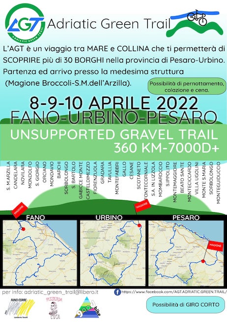 Tre i percorsi cicloturistici studiati e preparati con cura per i tre giorni di manifestazione, rispettivamente 360 km/7500D+ e 250 km /4500D+, prevalentemente Gravel (strade bianche e secondarie), con altrettanti itinerari-tracce Gps (lungo 130 km e medio 80 km giornalieri), da percorrere con il proprio passo. Partenza e arrivo saranno sempre dalla Magione Broccoli (Fano), una bella dimora di campagna destinata all’ospitalità e con tanti servizi adatti al cicloturismo.