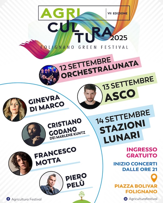 FOLIGNANO (AP) – Da venerdì 12 a domenica 14 settembre 2025, in Piazza Bolivar a Folignano, si terrà la settima edizione di Agricultura Folignano Green Festival, un evento tra musica, spettacolo, cultura e valorizzazione del territorio con ospiti d’eccezione.