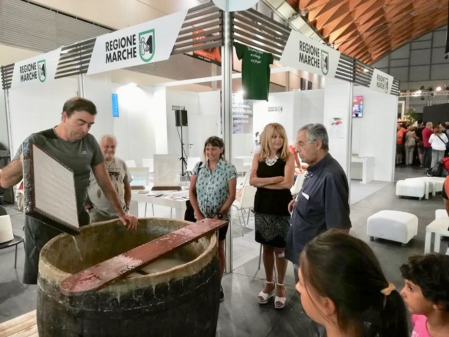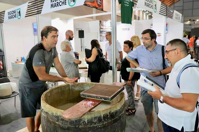 Nel pomeriggio lo stand si è trasformato in un laboratorio artigianale con la dimostrazione della carta fatta a mano. Grazie a due volontari del Museo della carta e della filigrana di Pioraco e ad una “gualchiera mobile” è stata fabbricata in loco la carta filigrana che è stata poi distribuita ai visitatori dello stand. “Per noi è stata una grande occasione per promuovere Pioraco e tutte le opportunità che offre il nostro territorio”, ha commentato il sindaco Matteo Cicconi.
