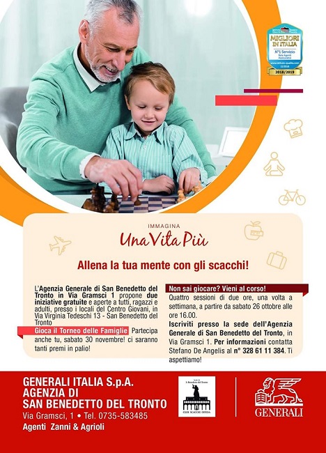 SAN BENEDETTO DEL TRONTO – Un corso di scacchi per creare nuovi giocatori, un torneo delle famiglie per far leva sul potere aggregante di torri, cavalli e alfieri e un partner che ha saputo vedere il valore aggiunto di cui il “nobil giuoco” è portatore: l’iniziativa di cui parliamo si chiama “Allena la tua mente” ed è proposta dall’agenzia Generali di Fabio Zanni in collaborazione con la A.S.D. Club Scacchi Offida. Si tratta di un’occasione unica nel suo genere per riunire genitori e figli, zii, nonni e nipoti (dai 7 anni in su) attorno alla scacchiera, dando loro la possibilità di apprezzare gli scacchi divertendosi, in famiglia.