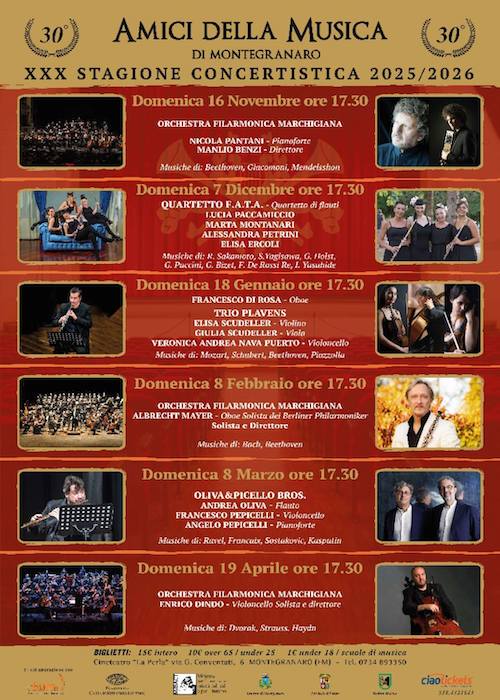Gli Amici della Musica di Montegranaro, che festeggiano 30 anni di attività, presentano la nuova stagione musicale. Debutto domenica 16 novembre con l’Orchestra Filarmonica Marchigiana