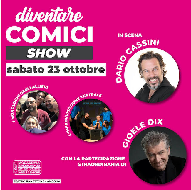 Sabato 23 ottobre alle 21.00, invece, sul palco del teatro Panettone di Ancona, spazio allo spettacolo di improvvisazione teatrale realizzato dagli allievi della scuola di comicità che portano in scena i monologhi nati durante le tante ore di lezione. A seguire, one-man show di Dario Cassini e la partecipazione straordinaria di Gioele Dix.