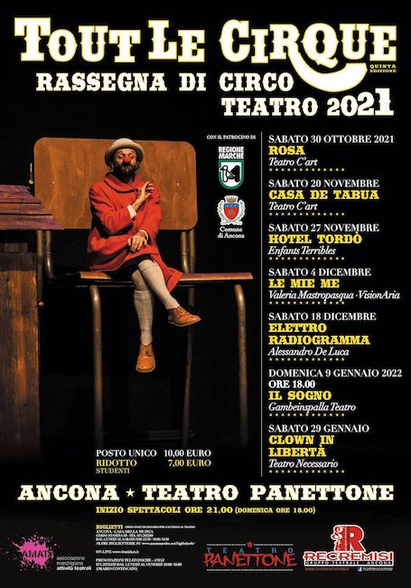 ANCONA – Dopo i primi tre spettacoli di “Made in Marche”, prende il via sabato prossimo 30 ottobre 2021, alle ore 21.00 al Tetro Panettone la quinta edizione della rassegna di Circo Teatro TOUT LE CIRQUE. Si tratta, cosa rara, di One woman-show: sul palco una donna, Rosa, con una serie di gag comiche, da cui emerge il lato buffo e allo stesso tempo delicato dell’essere umano. Uno show dove il ritmo è il tappeto sopra il quale scorrono i desideri della protagonista, intriso di un linguaggio non verbale, che parla a tutti. Rosa gioca con il suo corpo a 360° gradi, alterna scivolate e cadute clownesche a urli di voce in varie lingue, passi di flamenco imbizzarriti a equilibri precari, e poi improvvisazioni e poesia, il tutto all’ombra di un attaccapanni gigante, a cui sono appese le strampalate idee di una donna. Uno spettacolo provocatorio, di e con Teresa Bruno e con la regia di André Casaca, con la produzione del Teatro C’Art, che si muove sul sottile ma ben solido filo della comicità. Una semplice e surreale scenografia e pochi oggetti di scena, che diventano a tratti complici a tratti nemici di Rosa, oggetti stravolti nella loro ordinarietà quotidiana dallo sguardo del clown. Lo stesso sguardo che trasporta lo spettatore di ogni età in mondi nuovi, rapito dal corpo di una donna che avanza, inesorabile, esibendosi nelle sue strampalate ma coinvolgenti evoluzioni spericolate.