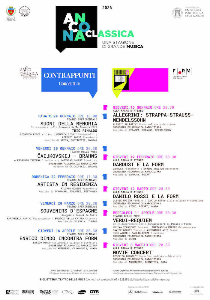 ANCONA – Ad inaugurare la stagione musicale 2026 del capoluogo di regione, Ancona Classica, sotto l’egida del Comune di Ancona, realizzata grazie alla già collaudata collaborazione tra la FORM e gli Amici della Musica Guido Michelli, con il sostegno dell’Università Politecnica delle Marche è Alessio Allegrini, primo corno dell’Orchestra dell’Accademia Nazionale di Santa Cecilia, in veste di solista e direttore e artista in residenza FORM per il 2026.