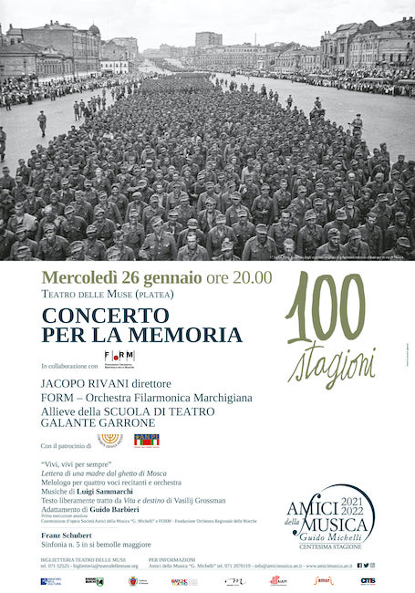 ANCONA – Con il patrocinio della Comunità Ebraica di Ancona e dell’A.N.P.I., e per la prima volta in collaborazione con la FORM – Orchestra Regionale delle Marche, mercoledì 26 gennaio alle ore 20 al Teatro delle Muse, si aprirà la seconda parte della Centesima Stagione della Società Amici della Musica “G. Michelli con un appuntamento ormai ricorrente da molti anni: la celebrazione del Giorno della Memoria.