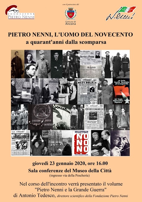 ANCONA – Giovedì 23 gennaio, alle ore 16.00, ad Ancona nella sala conferenze del Museo della Città di Ancona (ingresso Via della Pescheria), si terrà una conferenza organizzata dalla Fondazione Nenni di Roma e dal Circolo “Pietro Nenni” di Ancona, con il patrocinio del Comune di Ancona, sul tema :“PIETRO NENNI, L’UOMO DEL NOVECENTO” a quarant’anni dalla scomparsa.