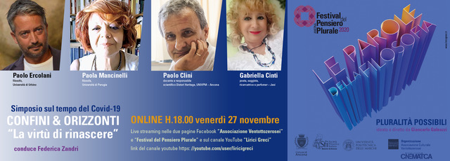 A queste due iniziative (precedentemente programmate) ne è stata aggiunta una terza con riferimento alla attuale situazione pandemica che si terrà il 27 novembre, cioè a ridosso della Giornata mondiale della filosofia: un incontro a più voci intitolato Simposio sul tempo del Covid-19, Confini e orizzonti “La virtù di rinascere”: vi parteciperanno i filosofi Paolo Ercolani dell’Università di Urbino e Paola Mancinelli, dell’Università di Perugia, il professor Paolo Clini e la poetessa Gabriella Cinti. L’ incontro è anche occasione della presentazione del libro “Confini & Orizzonti: Covid-19 trentacinque voci per trentacinque giorni” pubblicato dall’editrice Theta Edizioni di Raffaella Scortichini e Agnese Ausili.