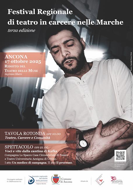 avverrà con la restituzione alla comunità regionale del lavoro svolto nei laboratori teatrali attivi nell’anno presso gli Istituti penitenziari marchigiani; il 17 ottobre, presso la Sala Ridotto del Teatro delle Muse di Ancona, i cittadini saranno chiamati a partecipare, alle 10.00, alla Tavola rotonda su “Teatro, carcere e Comunità”, quale occasione di riflessione condivisa sull’essere uomo dentro e fuori il carcere, e alle 21.00 alla messa in scena della rappresentazione teatrale “Voci e vite dalla cantina di Kafka”.