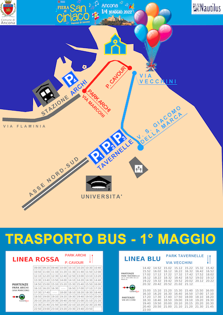 Nei giorni 2 e 3 maggio il capolinea del bus navetta sarà presso il parcheggio dello Stadio del Conero, inoltre il bus transiterà presso i parcheggi di Tavernelle-cimitero, in via S. Giacomo della Marca. Sarà inoltre disponibile, come di consueto, il parcheggio degli Archi, da cui sarà possibile raggiungere il centro e la zona della fiera utilizzando la linea 1/4.