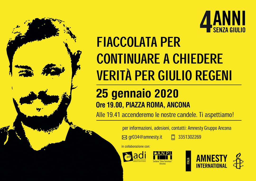 ANCONA – In occasione del quarto anniversario dalla scomparsa di Giulio Regeni tornano le fiaccolate e le manifestazioni organizzate in tutta Italia e nelle Marche, nella settimana del 25 gennaio.