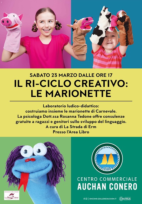 ANCONA – Sabato 23 marzo 2019,dalle ore 17.00, presso l’Area Libro del Centro Commerciale Auchan Conero, l’Associazione ludico-culturale La Strada di Erm curerà il laboratorio ludico-didattico per bambini Il Ri-ciclo Creativo: Le Marionette.