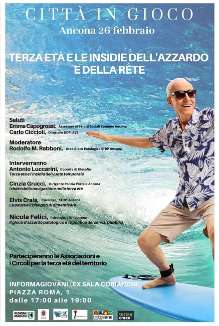ANCONA – In occasione della Giornata Regionale contro il Gioco d’Azzardo Patologico (GAP), il 26 febbraio 2020, dalle 17:00 alle 19:00, il Servizio Territoriale Dipendenze Patologiche di Ancona ha organizzato, in collaborazione con l’Amministrazione Comunale, un incontro dal titolo “TERZA ETA’ E LE INSIDIE DELL’AZZARDO E DELLA RETE.