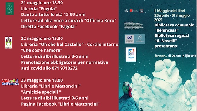 Dal 21 al 23 maggio- in occasione del 700° anniversario della morte- si inizia con “Amor di Dante … in libreria” con il coinvolgimento di alcune librerie cittadine sensibili alla promozione della lettura nella fascia dei bambini e dei ragazzi.