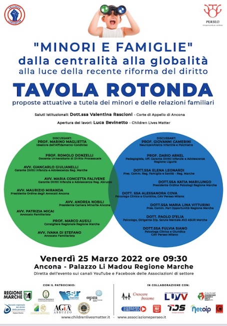 ANCONA – Venerdì 25 Marzo 2022, alle ore 09.30, a Palazzo Li Madou (Regione Marche) in Via Gentile da Fabriano, ad Ancona si terrà la Tavola rotonda di interesse nazionale: “MINORI E FAMIGLIE” dalla centralità alla globalità, alla luce delle recenti modifiche al diritto di famiglia.