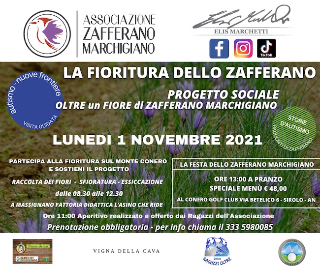 Lunedì 1 Novembre 2021 sarà la giornata dedicata alla festa dello Zafferano Marchigiano che nasce e cresce nella splendida Regione Marche, organizzata dall’omonima Associazione, in collaborazione con Ragazzi Oltre ODV e la Fattoria Didattica L’asino che Ride.