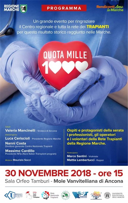 ANCONA – Venerdì 30 novembre, alla Mole Vanvitelliana di Ancona, la Regione festeggerà i mille trapianti effettuati nelle Marche. È in programma, con inizio alle ore 15.00 ,nella Sala Orfeo Tamburi, “Quota Mille” un grande evento per ringraziare il Centro regionale e tutta la rete dei trapianti per questo risultato storico raggiunto. Ospiti e protagonisti del pomeriggio saranno i professionisti, gli operatori e i volontari.