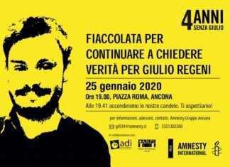 ANCONA - In occasione del quarto anniversario dalla scomparsa di Giulio Regeni tornano le fiaccolate e le manifestazioni organizzate in tutta Italia e nelle Marche, nella settimana del 25 gennaio.
