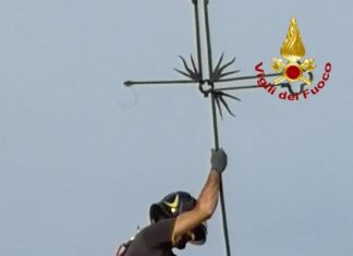 ANCONA - I vigili del fuoco sono intervenuti a Filottrano (Ancona), in via Rosselli, per rimuovere la croce in ferro pericolante sul tetto della chiesa di Santa Maria degli Angeli.