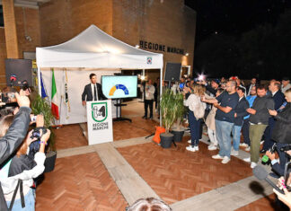 Dopo la riconferma, in serata, il presidente è arrivato a Palazzo Leopardi, sede della Regione Marche, per un saluto istituzionale.
