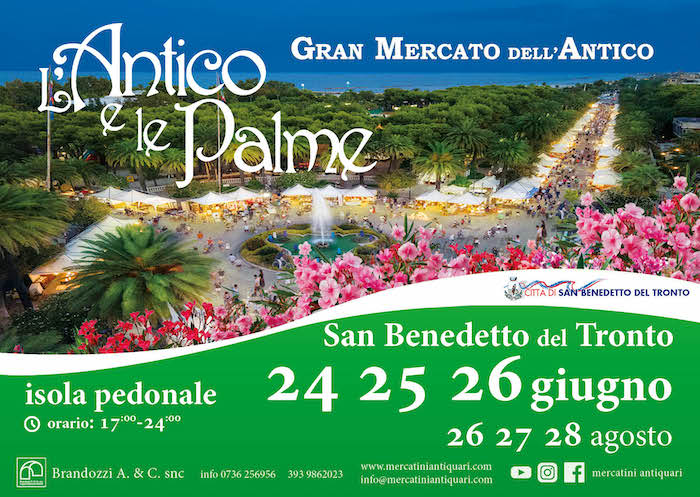 SAN BENEDETTO DEL TRONTO – L’Antico e le Palme torna con la prima delle due edizioni estive dal 24 al 26 giugno nell’isola pedonale di San Benedetto del Tronto, nel cuore della riviera adriatica, appuntamento fisso dal 1994. La manifestazione sambenedettese di antiquariato e collezionismo è una delle rassegne più conosciute tra i mercatini dell’antiquariato del centro Italia e non solo, divenuto negli anni un punto di riferimento per migliaia di appassionati di oggetti che fanno parte del nostro passato e delle nostre tradizioni.