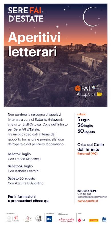 Tra le più interessanti in calendario, gli “Aperitivi letterari” organizzati dal FAI all’Orto sul Colle dell’Infinito a Recanati (MC) sabato 5 e 26 luglio e 30 agosto alle ore 18.30: una rassegna di incontri a cura del critico letterario e saggista Roberto Galaverni, con alcune tra le più apprezzate giovani voci poetiche del panorama nazionale, dedicati al tema del rapporto tra natura e poesia, alla luce dell’opera e del pensiero leopardiano.