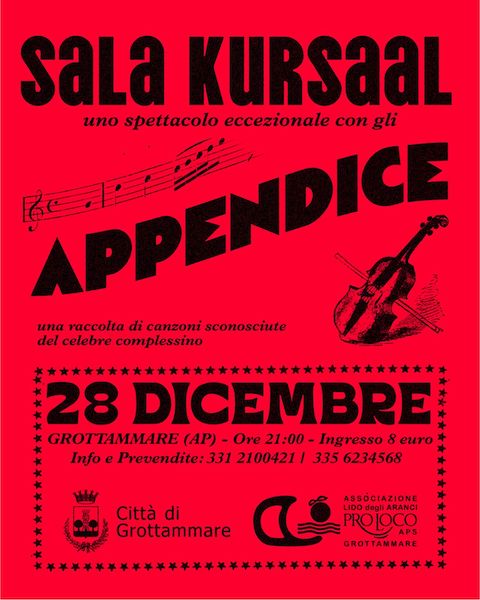 GROTTAMMARE – Domenica 28 dicembre alle ore 21.15 presso la sala Kursaal di Grottammare andrà in scena il concerto degli “Appendice” …in una raccolta di canzoni sconosciute del celebre complessino! come descritto nel loro manifesto ufficiale. “Appendice” è un progetto musicale dalle sonorità pop/cantautorali e dalla forte presenza scenica. Il complessino, formatosi ormai da cinque anni, ha all’attivo una raccolta di brani inediti che ha deciso di condividere con il pubblico in occasione dello spettacolo del 28 dicembre al mitico Teatro Kursaal della cittadina rivierasca.