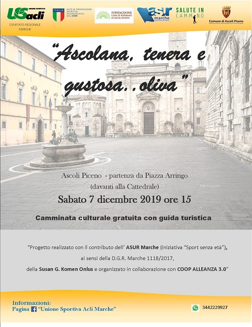 “Ascolana, tenera e gustosa oliva” rientra nel progetto “Sport senza età” che è organizzato dall’Unione Sportiva Acli Marche, col patrocinio dell’amministrazione comunale, col sostegno dell’Asur Marche, della Fondazione Cassa di risparmio di Ascoli Piceno, di Susan G. Komen Onlus e di Coop Alleanza 3.0.