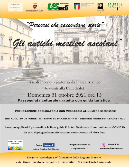 Il programma dell’iniziativa, realizzata a cura dei partner progettuali Circolo Acli Romero Asd Aps e U.S. Acli Marche Aps, prevede il raduno dei partecipanti in Piazza Arringo alle ore 15 e poi il via ad un percorso culturale curato dalla guida turistica abilitata Valentina Carradori, che parlerà della storia della città partendo dagli antichi mestieri.