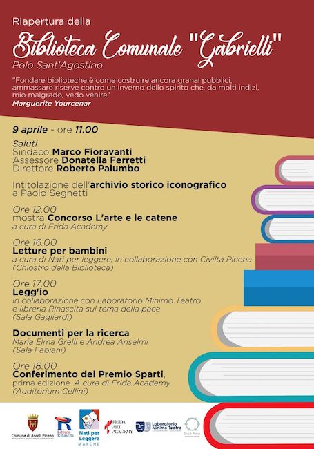 ASCOLI PICENO – Sabato 9 aprile 2022, al Polo Sant’Agostino, ad Ascoli Piceno, si svolgerà la cerimonia di riapertura della biblioteca comunale “Gabrielli”