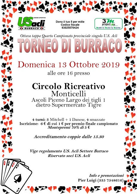 ASCOLI PICENO – Domenica 13 ottobre, presso la sede del Circolo Ricreativo Monticelli in via dei tigli 1, si svolgerà l’ottava tappa del campionato provinciale singolo di burraco dell’U.S. Acli giunto alla quarta edizione.
