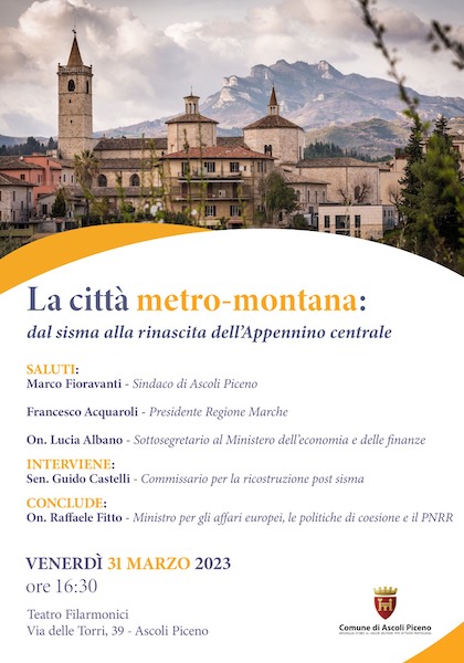 ASCOLI PICENO – Venerdì 31 marzo 2023, alle ore 16.30, presso il Teatro dei Filarmonici di Ascoli Piceno, si terrà l’incontro “La città metro-montana: dal sisma alla rinascita dell’Appennino centrale”. Prevista la partecipazione del Ministro per gli Affari Europei, le Politiche di coesione e il PNRR On. Raffaele Fitto.