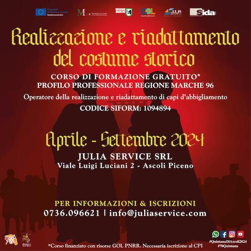 ASCOLI PICENO – Nell’anno in cui si celebra il settantennale della Quintana, promosso dalla Regione Marche, nell’ambito dell’avviso Gol, finanziato con risorse PNRR, arriva il corso di formazione gratuito di “Realizzazione e riadattamento del costume storico”, che si svolgerà indicativamente da aprile a settembre. Dopo la grande attenzione posta al benessere degli animali, all’allenamento dei cavalieri e all’organizzazione delle tenzoni per musici e sbandieratori, ecco la possibilità di creare profili qualificati, attraverso la formazione riguardante la sartoria di abiti storici. Il profilo professionale previsto dal corso, promosso e realizzato dall’ente formativo Julia Service, è “Operatore della realizzazione e riadattamento capi d’abbigliamento” (profilo professionale Regione Marche 96 – codice Siform 1094894) e la docenza sarà affidata alle mani sapienti di Anna Marini e Massimo Mancini. La formazione è, come detto, finanziata dalla Regione Marche con le risorse del programma PNRR GOL.