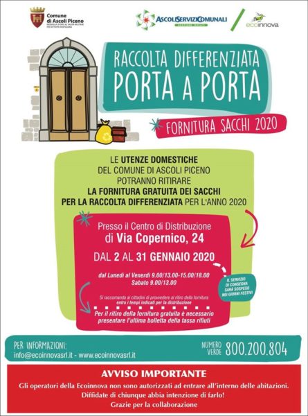 ASCOLI PICENO – Il Comune di Ascoli Piceno rende noto che i cittadini possono ritirare la fornitura gratuita dei sacchi per la raccolta differenziata porta a porta per l’ anno 2020 presso il Centro di Distribuzione di Via Copernico, 24 fino al 31 gennaio 2020 (il servizio di consegna sarà sospeso nei giorni festivi)