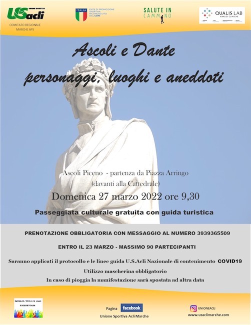ASCOLI PICENO – Domenica 27 marzo 2022, con partenza alle ore 9,30 davanti alla Cattedrale di Ascoli Piceno in piazza Arringo, prenderà il via “Ascoli e Dante: personaggi, luoghi e aneddoti”, iniziativa gratuita a cura di Unione Sportiva Acli Marche Aps.