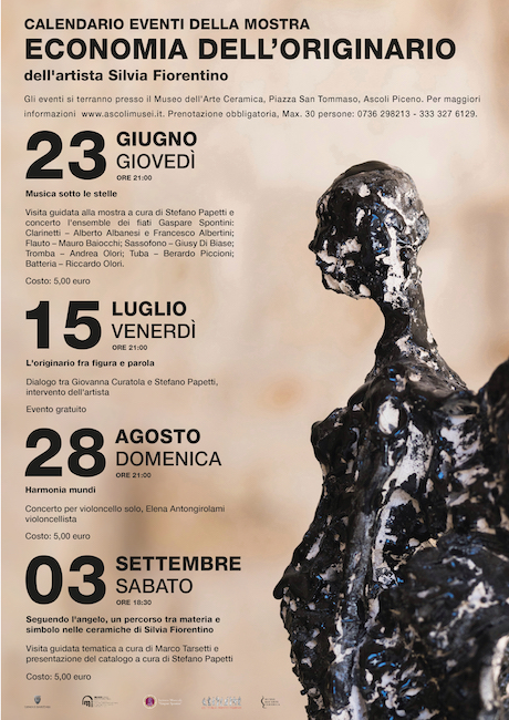 INFO UTILI – Gli eventi hanno un costo di 5.00 €, ad eccezione della gratuità riservata all’appuntamento “L’originario tra figura e parola” di venerdì 15 luglio 2022. Il Museo dell’Arte Ceramica di Ascoli Piceno è ubicato in Piazza San Tommaso. Dal 1° aprile al 30 settembre rispetterà i seguenti orari d’apertura: sabato, domenica, festivi e prefestivi dalle ore 15:00 alle 19:00. Giorno di chiusura: lunedì (esclusi festivi). Biglietto d’ingresso intero: €4, ridotto: €2. Per info e prenotazioni: 0736 298213 (dal martedì alla domenica, 10.00 – 19.00) / www.ascolimusei.it / FB e IG @ascolimusei. Tutti gli eventi connessi alla mostra personale Economia dell’originario di Silvia Fiorentino si terranno nel rispetto delle vigenti norme anti Covid-19.