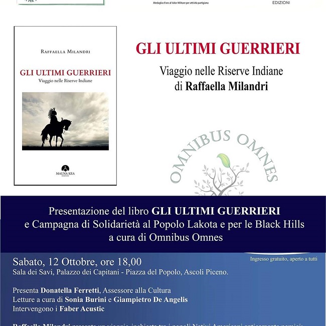 ASCOLI PICENO – Sabato 12 ottobre 2019 alle 18.00, presso la Sala dei Savi del Palazzo dei Capitani, in Piazza del Popolo ad Ascoli Piceno, si svolgerà l’incontro a cura della Omnibus Omnes e con patrocinio del Comune di Ascoli Piceno “Gli Ultimi Guerrieri”, dedicato ai Nativi Americani e alla presentazione del nuovo libro di Raffaella Milandri.