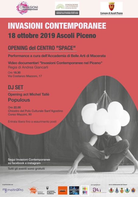 Invasioni Contemporanee è un progetto realizzato grazie al sostegno della Fondazione Cassa di Risparmio di Ascoli Piceno da: Comune di Ascoli Piceno, Melting Pro, Accademia di Belle Arti di Macerata, Associazione Marchigiana Attività̀ Teatrali, Cotton Lab, Defloyd, Dimensione Ascoli. Patrocinato dal GAI – Giovani Artisti Italiani.