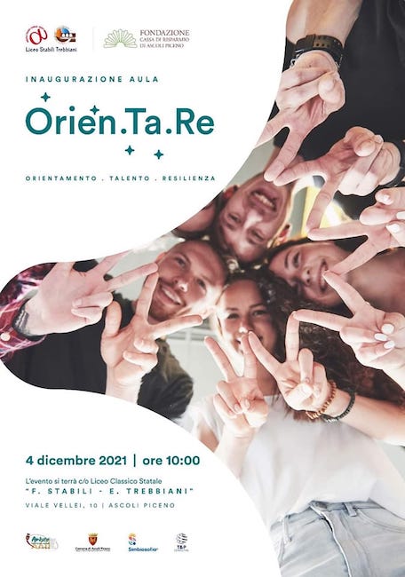 ASCOLI PICENO – Sabato ,4 dicembre 2021, alle ore 10.00, presso il Liceo Classico “Stabili Trebbiani” di Ascoli Piceno, si terrà la presentazione ufficiale dei corsi di formazione per le “comunità educanti”,che inizieranno ufficialmente a gennaio. In tale data è prevista l’inagurazione dell’aula Orien.ta.re nell’ambito dell’omonimo progetto promosso dal Liceo Classico Stabili Trebbiani ,dal centro di formazione Simbiosofia e dalla società T&P Consulting.