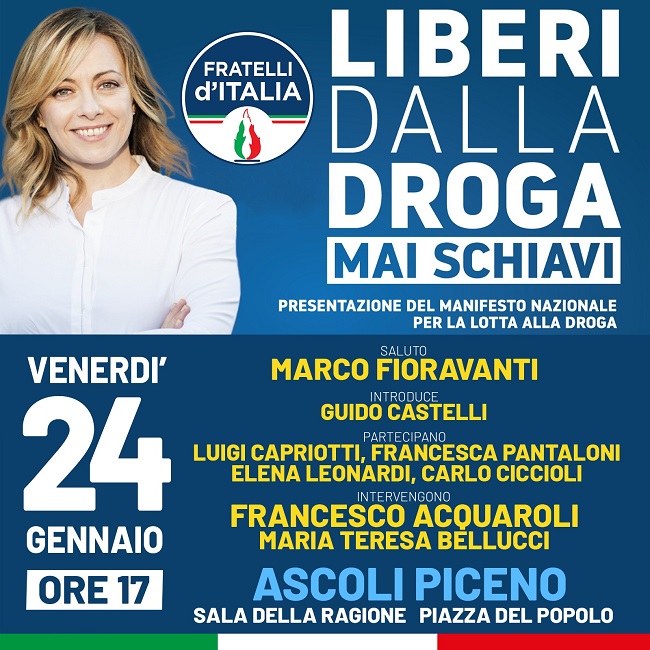 Anche ad Ascoli Piceno il 24 gennaio 2020, alle ore 17.00, nella sala della Ragione di Palazzo dei Capitani verrà presentato il manifesto nazionale per la lotta alla droga alla presenza dell’on Bellucci e di tutto il coordinamento regionale e provinciale del Partito.