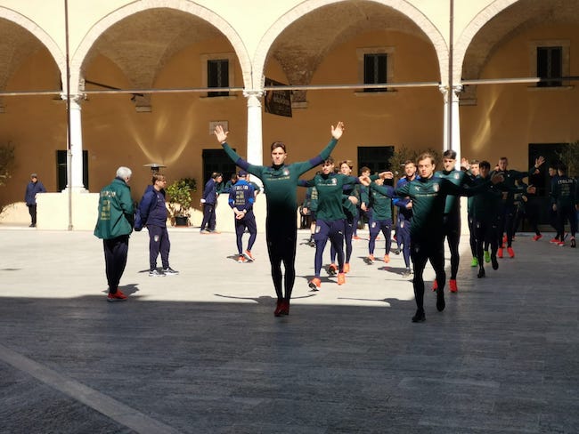 Foto della Nazionale Under 20 durante il risveglio muscolare al chiostro di San Francesco