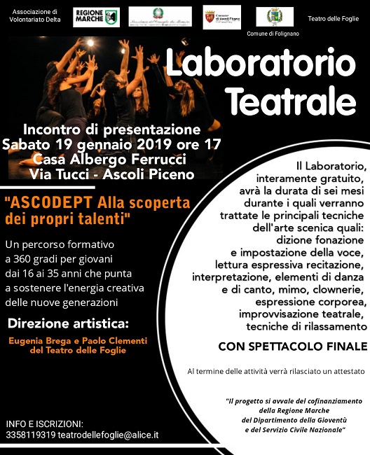 ASCOLI PICENO – Prenderà il via sabato 19 gennaio il progetto “Ascodept – Alla scoperta dei propri talenti”,un percorso formativo teatrale a 360 gradi per giovani dai 16 ai 35 anni che punta a sostenere l’energia creativa delle nuove generazioni.
