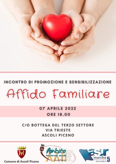 ASCOLI PICENO – Giovedì 7 aprile alle ore 18, presso la Bottega del Terzo settore ad Ascoli, l’Amministrazione comunale e l’Ambito Territoriale XXII, in collaborazione con il consultorio dell’Asur Marche 5 – Zona territoriale 13, organizzano un incontro al fine di promuovere il percorso dell’affido familiare. Partendo da quanto fatto in passato, l’incontro, a cui parteciperanno le associazioni e le famiglie interessate, sarà un primo contatto per ristabilire le tappe di un percorso che possa portare a diffondere sul nostro territorio la cultura dell’affido familiare quale strumento al servizio di una comunità inclusiva.