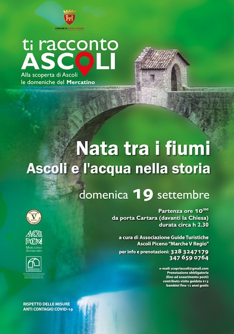 Diventato ormai un appuntamento fisso delle domeniche del mercatino, riprende anche Ti Racconto Ascoli. Una esperta guida dell’Associazione Marche V Regio condurrà i visitatori alla scoperta della città con una passeggiata nell’Ascoli nata tra i due fiumi tra ponti, porte e fonti dal fascino unico e dalla storia antica. Unico orario domenica mattina alle ore 10 con partenza da Porta Cartara davanti la Chiesa, contributo di partecipazione € 15 (bambini sotto i 12 anni esenti). Saranno rispettate tutte le norme anti-Covid.