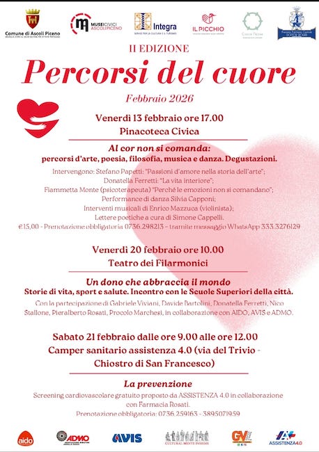 L’evento promosso dagli Assessorati all’Istruzione e allo Sport e dai Musei Civici di Ascoli Piceno, in programma dal 13 febbraio, si conferma come un percorso culturale e sociale capace di unire linguaggi diversi, dall’arte allo sport, per sensibilizzare la cittadinanza su temi di grande rilevanza civile come la donazione degli organi e la prevenzione delle malattie cardiovascolari.