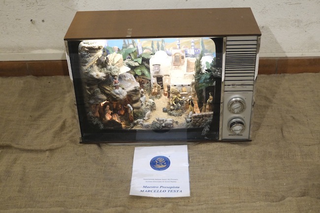 A Palazzo dei Capitani invece, Marcello Testa propone il suo presepe dentro un vecchio televisore: il suo è un lavoro realizzato nell’ambito delle attività proposte dall’associazione italiana “Amici del presepio”, che persegue lo scopo di rinnovarne le tradizioni, l’arte e la storia attraverso mostre, conferenze e corsi di tecnica.