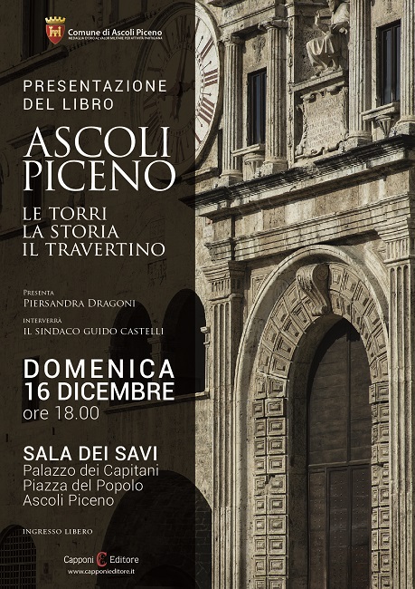 ASCOLI PICENO – Domenica 16 dicembre 2018,alle ore 18.00,presso la Sala dei Savi di Palazzo dei Capitani,in Piazza del Popolo ad Ascoli Piceno si terrà la presentazione del libro “Ascoli Piceno.Le torri, la storia, il